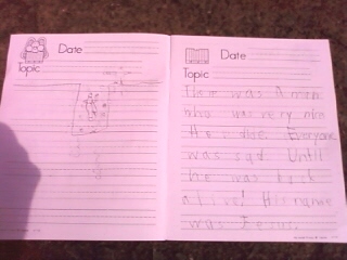 Today Nathaniel brought me some of his school work – specifically his journal that he writes in each day. Here is what he wrote today “ There was a man who was very nice. He dide (died). Everyone was sad. Until he was back alive! His name was Jesus.”